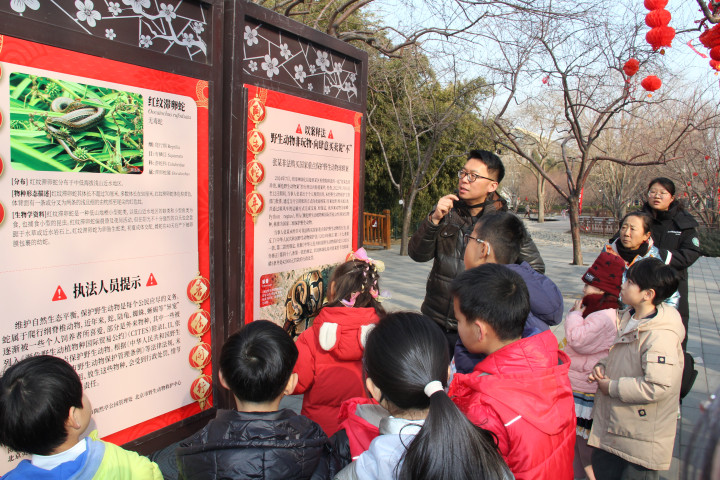 展出收缴非法猎捕工具、发放蛇类科普图册、摆放科普展板……1月23日,农历蛇年来临前,市园林绿化局执法处、陶然亭公园管理处、市野生动物救护中心联合开展了以“陶乐蛇年普法同行”为主题的普法宣传活动。